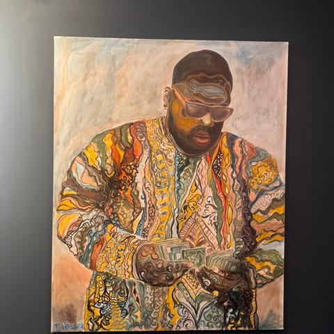 Veggbilde med portrettmotiv av den legendariske Biggie Smalls med krone, solbriller og flerfarget genser mot rød bakgrunn. Bildet har et grafisk, moderne uttrykk med sterke farger og tydelige kontraster. Motiv trykket på plate/lerret egnet for oppheng på vegg i stue, kontor eller andre oppholdsrom. Et ekstremt unikt kunstobjekt fra den verdenskjente digitale kunstneren DesignGeo. Eneste eksemplaret laget, 1/1. Her har du muligheten til og skaffe det noe unikt og sjeldent. Ideel kunstivestering.