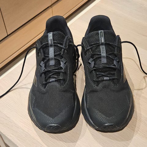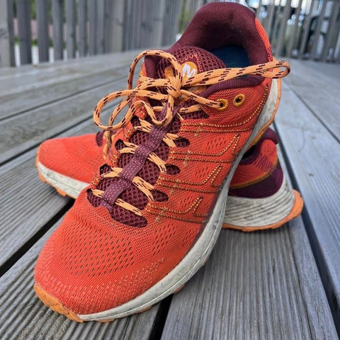 Merrell løpesko i størrelse 38. Skoene er i svart farge med overdel i pustende mesh-materiale og snøring foran. Modellen er merket som «Women’s» på innersiden, og passer derfor til dame. Sålen er relativt tykk for demping ved løping og annen trening. Egner seg til løping og annen lett trening utendørs eller innendørs.