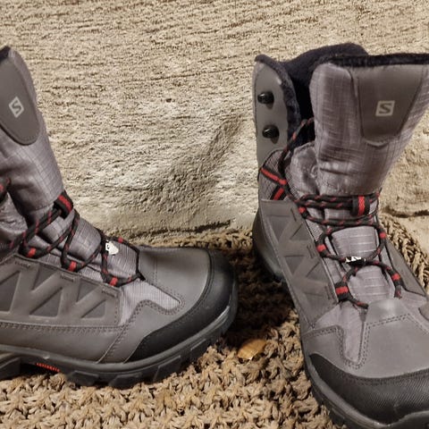 Salomon støvler i størrelse 37 1/3. Modellen er en høy tursko/støvel med snøring og kraftig yttersåle med grovt mønster. Fargekombinasjon brun og svart med kontrastdetaljer. Overdelen består av tekstil og syntetiske materialer med forsterkninger på tå og hæl. Polstret skaft og pløse for økt komfort. Egnet som tursko eller fritidsstøvler i variert terreng.