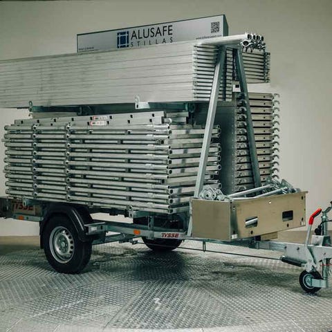 Jamax stillashenger med 132m2 stillas pluss noen deler. Hengeren gjør det enkelt med transport og lagring på byggeplassen.