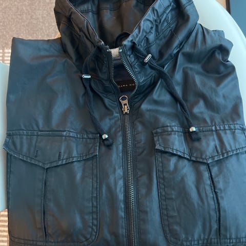 Zara ytterjakke for dame i størrelse L. Jakken er laget i skinnmateriale med brun hovedfarge og kontrastfelt i lysere tone. Modellen har hette, glidelåslukking foran og store frontlommer. Innsiden har mykt, lyst fôr som gir ekstra komfort. Passer som yttertøy i kjøligere vær.
