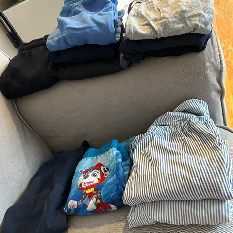 2 gensere, 1 bukse, 3 tskjorter, 3 sett nattøy og en fin shorts