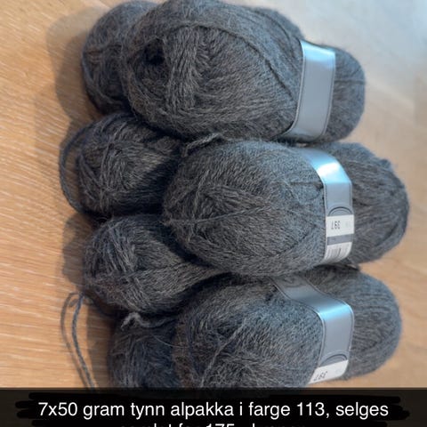 Ca 8,5 nøster med tynn alpakka i farge 193 selges samlet.