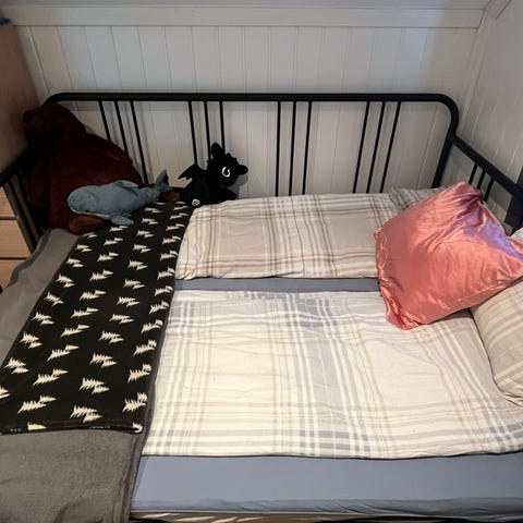 • Madrassen som ligger i hovedsengen er godt brukt. Den kan medfølge om ønskelig, men kjøper må selv vaske/rense den etter eget ønske. (Jeg opplever den som krevende å rengjøre.)