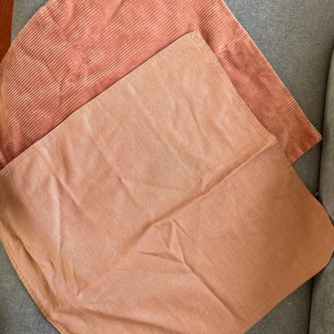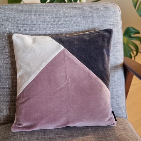 Pute i en nydelig rosafarge med dekorativt tufted mønster på forsiden og dusker langs kantene 🌸