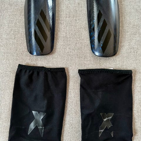 Adidas Tiro leggskinn for fotball. Settet består av to leggskinn med svart grunnfarge og kontraststriper, to svarte kompresjonsstrømper/holdere samt en svart oppbevaringspose med Adidas-logo. Leggskinnene er beregnet for bruk til fotball og gir beskyttelse av leggen under trening og kamp. Passer til bruk sammen med vanlige fotballstrømper. competition utgaven. Ny pris ca 450.