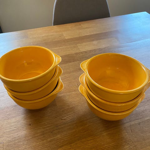 Sagaform ildfaste porsjonsformer i keramikk. Utsiden er rød og innsiden hvit. Settet består av fire små former som egner seg til porsjonsretter som desserter, gratenger eller til servering av tilbehør. Design av Linda Sjunnesson, merket under bunnen.