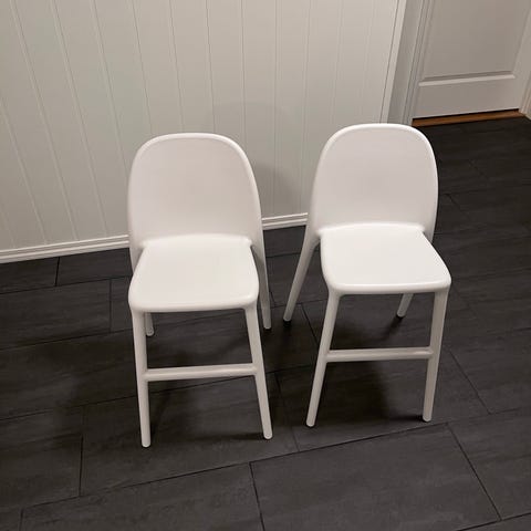 IKEA Urban høy barnestol i hvit plast. Stolen har hel rygg og sete med integrert fotstøtte i samme materiale. Egnet som høy stol for barn ved spisebord eller kjøkkenøy. Lett å tørke av og flytte på, og kan brukes innendørs i hjemmemiljø som kjøkken eller spisestue.