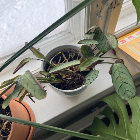 Grønn inneplante i potte med høy, slank stamme og ovale blader. Planten står i en enkel plastpotte og passer som grønn dekorasjon innendørs, for eksempel i stue, gang eller kjøkken. Egner seg plassert nær et vindu med godt lys. Litt usikker på hva planten heter, men mener det er en fiken-variant.