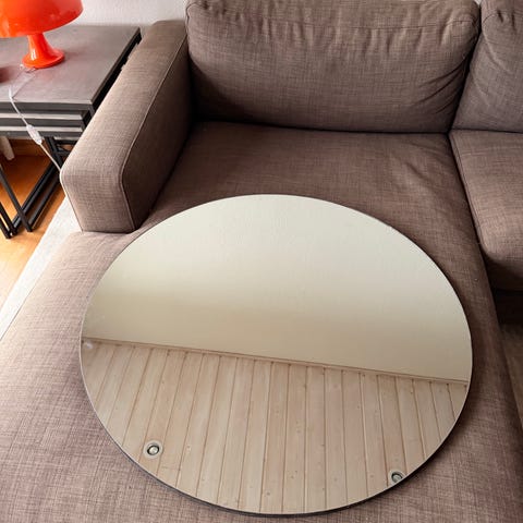 Pent brukt speil med gullkant! Kan henges opp på vegg eller brukes som bordfat. Må hentes