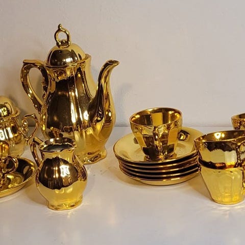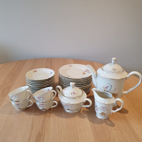 Porselen kaffeservise kremfarget med blomstermønster og gullkant