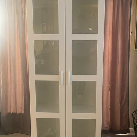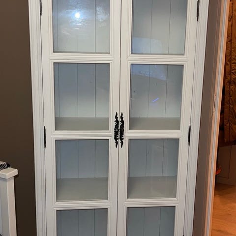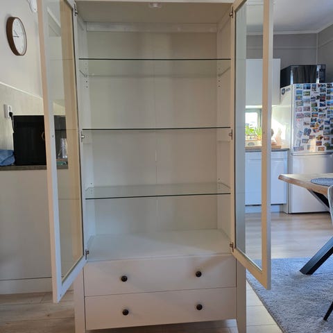 Selger et hvit vitrineskap med glassdører og glasshyller inni.Samt 2 oppbevaringskuffer under.Skapet er pent uten store merker.