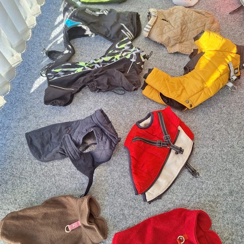 Selger pent brukte dekken til hund av god kvalitet. Brukt av cocker spaniel tispe på 12 kg. med dekkenmål 40 cm. Målene er fra halsbånd til halerot. (Her bor det også katter.)
