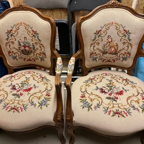 Selger to stk. vintage rokokkostol i tre med brodert trekk. Tidligere eier har fortalt at disse har stått på museum. Lite brukt.