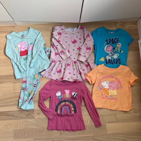Ene kjolen fra H&M er aldri brukt, kjolen i midten er godt brukt. Noe nupper på den genseren med cupcakes, ellers er verken pysjen eller den genseren med Bluey og Coco noe særlig brukt