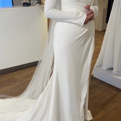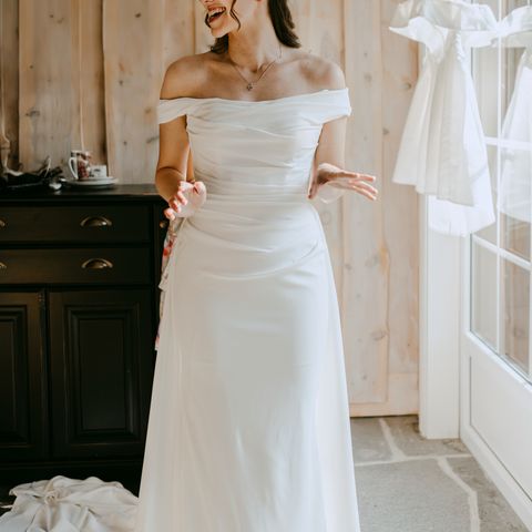 Opprinnelig pris 35.000. Kjøpt hos Larvik brudesalong 16.02.26. Har kvittering. Står str 12 uk på kjolen, men i norsk str vil den være en tilsvarende 38 tenker jeg.