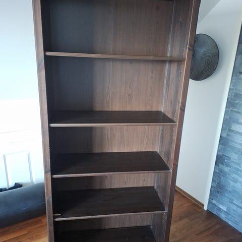 Møbel med fire hyller og skap nederst i mørkt tre. Møbelet er i god stand, men har en ripe på nederste hylle.