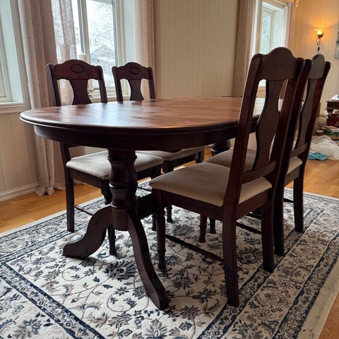 Spisebord med 6 stoler og 1 stk ileggsplate. 160 cm langt, 205 cm med ileggsplate.