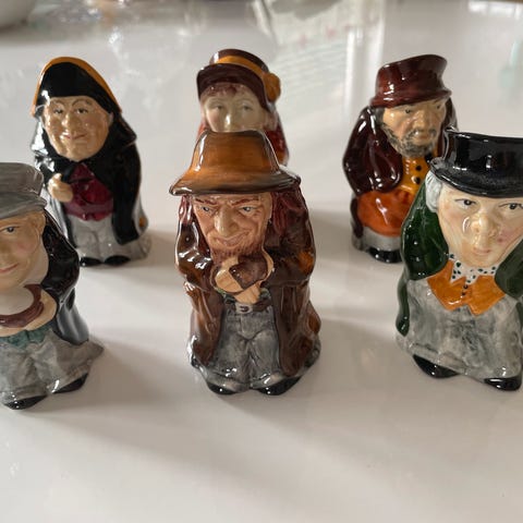 Ukjent merke keramikkfigurer flasker og karafler med ulike motiver. Samlingen består av flere figurative beholdere formet som personer og dyr, blant annet en brun «fyllehund»-flaske og flere menneskefigurer i ulike positurer og antrekk. Gjenstandene er laget i glasert keramikk i flere farger, hovedsakelig brun, blå, rød og beige. Egner seg som dekorative samleobjekter eller pyntegjenstander i hjemmet. Må hentes. Se priser på bilder. Kan selges samlet for 1500kr