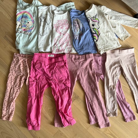 • t-skjortene har ikke vært brukt, pysjen og kjolen bærer preg av å være vasket en del, men ingen flekker eller hull.