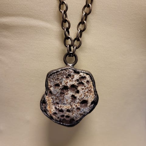 Ser ut som rå ametyst i midten. Anhenget er 6 cm i diameter og kjedet er ca 80 cm.