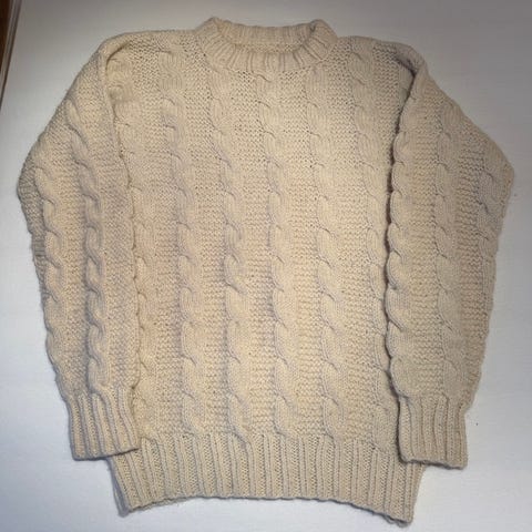 Ullgenser for herre i størrelse L i hvit/off-white farge. Genseren har høy hals og tydelig flettestrikket mønster kombinert med strukturstrikk på for- og bakside. Strikket i ull, som gir varme og isolasjon. Særdeles myk og god kvalitet på ullen.. Mål på genseren fremgår av bildene med målebånd for lengde og bredde.