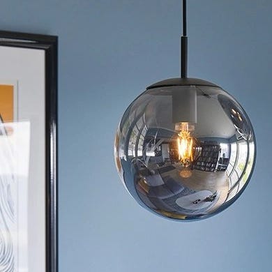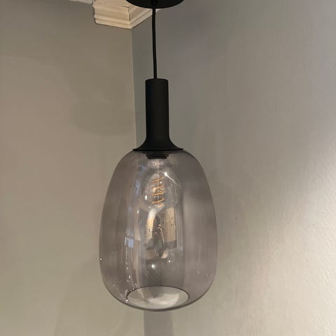 Taklampe pendel med rund glasskjerm i røykfarget glass. Lampen har sort oppheng og synlig lyspære som gir et dekorativt uttrykk. Egnet over spisebord, i stue, gang eller andre oppholdsrom. Lyspære medfølger, dimbar.