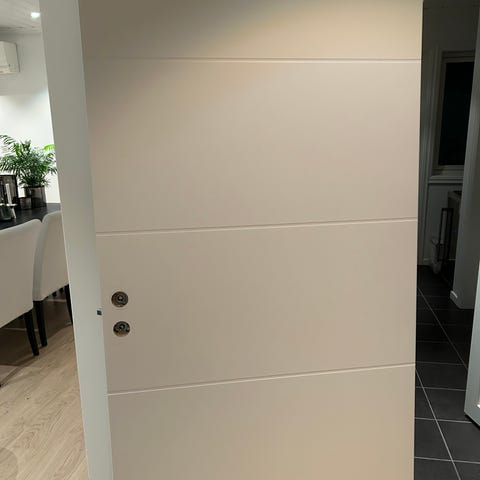 Innendørs skyvedør i hvit utførelse. Fra byggeår 1965.