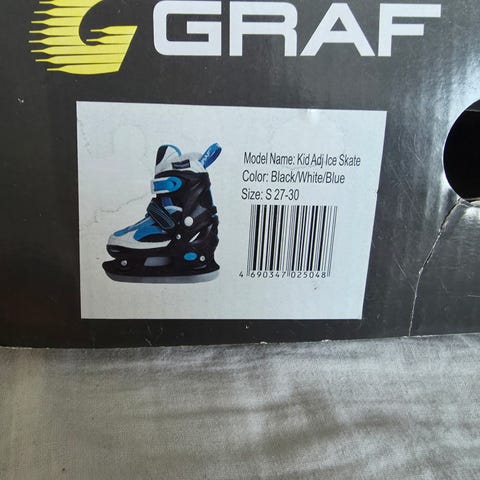 Graf justerbare ishockeyskøyter for barn i størrelse 27-30. Skøytene har hardt ytterskall med spenner for enkel justering og god støtte rundt ankelen. Fargekombinasjon svart og hvit. Egnet til ishockey og generell skøytebruk på is for barn.