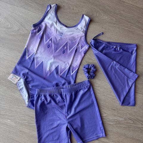 Flott sett med drakt, shorts og matchende scrunchie. Perfekt til turn, dans eller trening. Mykt og behagelig stoff med fin glans og flotte detaljer.