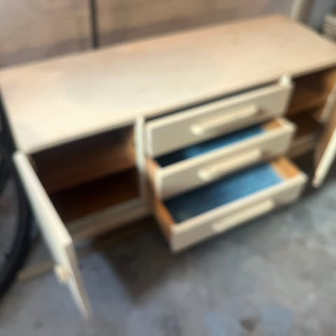 Den er gammel og godt brukt med en del bruksmerker. Men alle skuffer virker, det er kun kosmetisk.