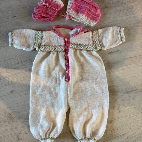 Søtt strikkesett til barn fra 90-tallet. Ca str 74-86. I god stand, ingen hull. Har liten flekk på benet, men går nok bort med På stell eller lignende.
