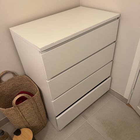 Nederste skuff er forvekslet med en likedan kommode jeg hadde tidligere (som nå er solgt), Den har derfor en litt annen farge og feste enn de andre. Men fungerer fint til oppbevaring likevel. ;)