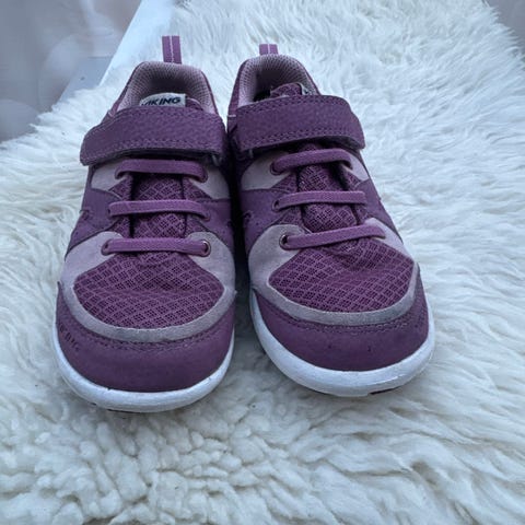 Viking joggesko for barn i størrelse 30 for jente. Skoene er i en lilla fargetone med hvit mellomsåle og mørk yttersåle. Modellen har kombinasjon av elastiske lisser (til pynt) og borrelåsrem over vristen for enkel av- og påkledning. Overdelen er i syntetisk materiale/tekstil med polstret hælkappe og tunge for bedre komfort. Yttersålen har mønster for grep. Egner seg til hverdagsbruk og lek ute for barn i aktuell skostørrelse.