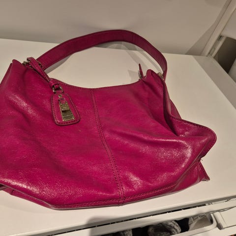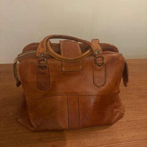 Liz Claiborne veske i mørkebrunt skinn. Høyde 34 cm, bredde 38 cm og dybde 6,5 cm. Det går an å bære den over skulderen. (Den er litt flat, som en dokumentmappe. Plass til en PC i standard størrelse.)