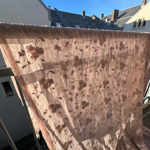 Kid gardiner i beige tekstil. Gardinene har rynkebånd med kroker for oppheng på skinne eller stang med ringer. Stoffet er lett strukturert og slipper inn noe lys samtidig som det skjermer for innsyn. Egnet til bruk i stue, soverom eller andre oppholdsrom. Har hatt de hengendes kun 1 måned.