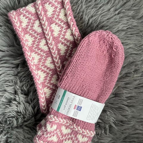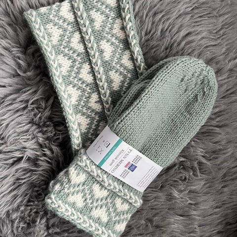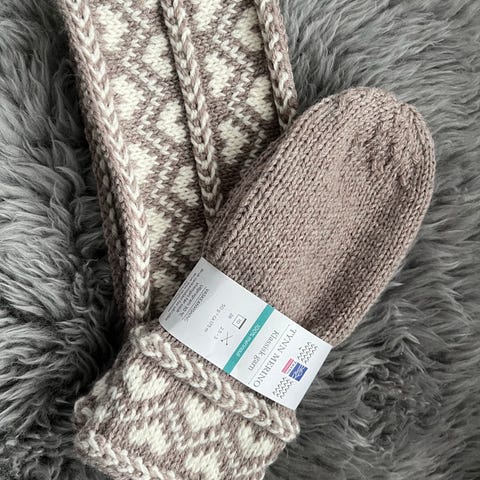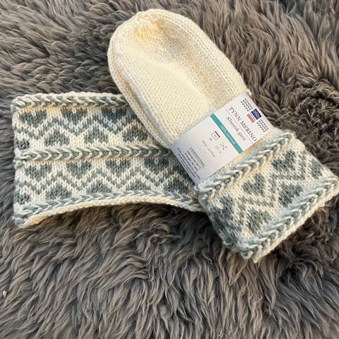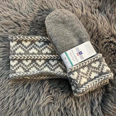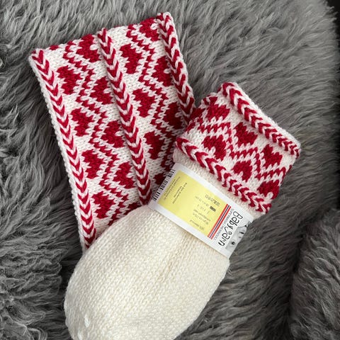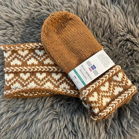Hjemmestrikket votter og ørevarmer/pannebånd