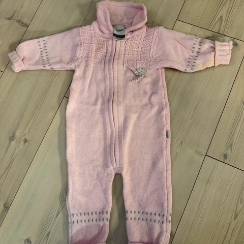 Dressen er rosa og strikket i ull. Den har glidelås foran for enkel av- og påkledning, samt lange ermer og ben som dekker godt. Egnet som ytterlag eller mellomlag til baby i kjøligere vær.