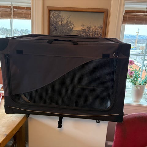 Sammenleggbart. Dør på både kortside og langside. L: 76 cm. B: 46 cm. H: 53 cm.