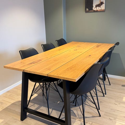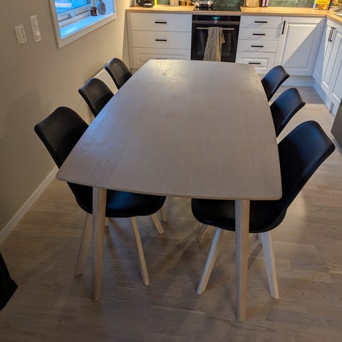 Eikefinert bord med 6 stoler. Selges billig da ene stolen er stygg og litt stygt på undersiden av bordplata