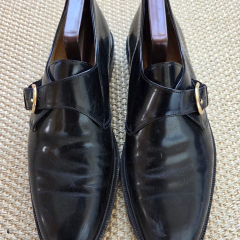 Giorgio Brutini Private Collection pensko i svart skinn i størrelse 42. Skoene har spiss, lett firkantet tå med dekorative sømmer og gullfargede metall-detaljer på tå og hæl. Modellen har rem over vristen med liten spenne på siden. Klassiske pensko som passer til dress og andre formelle antrekk. Nye sklisikre såler og forsterkninger utenpå lærsåle. Denne modellen er nå tilnærmet umulig å skaffe. Vintage fra begynnelsen av 90-tallet , kjøpt i Beverly Hills