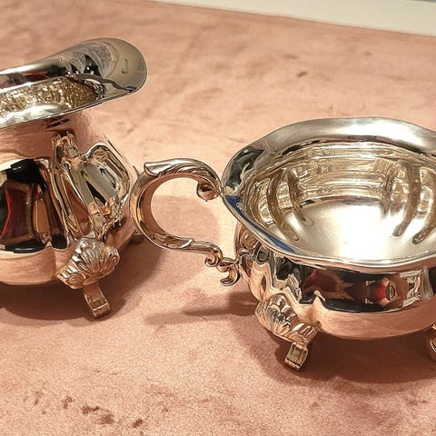 Sukkerskål og fløtemugge i sølv 925 med tilhørende ovalt serveringsfat i sølvplett . Settet egner seg til servering av kaffe og te, og kan brukes både til hverdags og ved mer formelle anledninger. Vekten på de to delene er målt til rundt 320 gram til sammen Passer som serveringssett på bord eller som dekorativt innslag i interiøret.