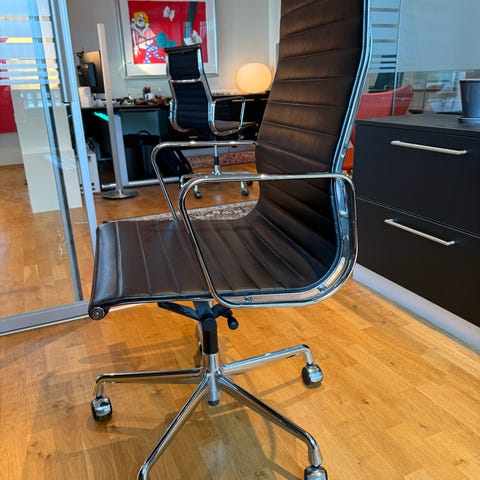 To originale Eames-stoler i sort skinn kjøpt nye hos Marnburg i Stavanger. De fleste andre slike fra Eames er kontorstoler, Denne er imidlertid veldig fin også til hjemmebruk. Uten hjul står den fast og fint på parketten og vil kle en stue. Den kan snurres. Ikke vipp og ikke høyderegulering.