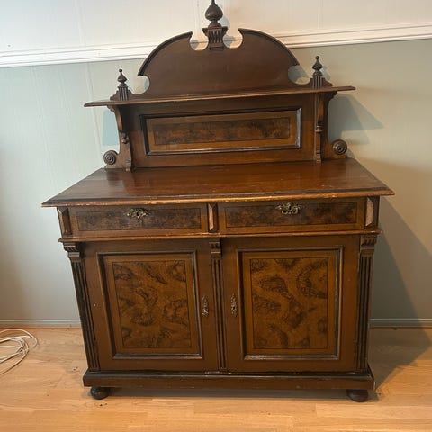 Skjenk med overskap i tre i brun utførelse. Møbelet har utskårne detaljer på dører og sider, samt dreide søyler på overskapet. Underdelen har skap med hyller innvendig for oppbevaring. Passer til bruk i stue, spisestue eller gang som oppbevaringsmøbel og avlastningsbord.Selger et gammelt skap som har stått ubrukt en stund. Vi kjøpte det sånn i sin tid, men vi tror det mangler noe på toppen. Litt usikre der. Kan ta av overskap. Har inget årstall å komme med. Kjøpte det på auksjon for mange år siden for 4000,-