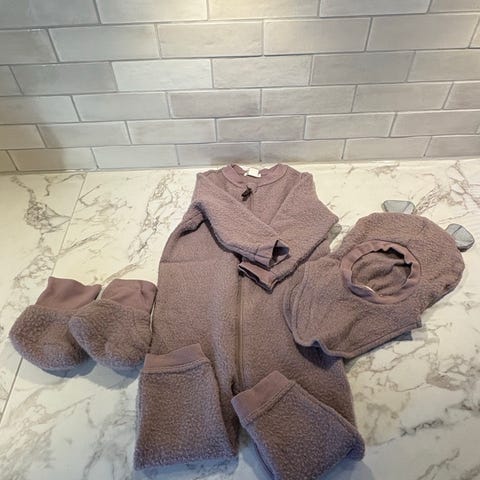 Myk og behagelig heldress / ulldress / jumpsuit fra Smallstuff i 100 % økologisk merinoull (ullfleece), str. 68/74 selges. Farge: lilla (violet). Perfekt for de minste!