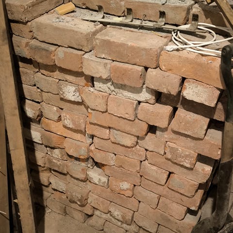Murstein hul rød teglstein. Røde, rektangulære teglstein med gjennomgående hull, egnet til murerarbeid, små konstruksjoner eller andre byggeprosjekter. Steinene inneholder noe murpuss og noen av stenene er delte.