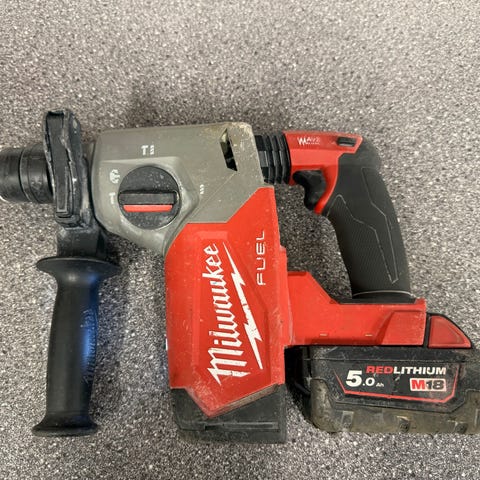 Milwaukee M18 ONEFHXDEL-552C borhammer i rød utførelse. Leveres i koffert med batteri og lader synlig på bildet. Batteridrevet borhammer egnet for boring og meisling i materialer som betong, mur og stein, samt generelle festearbeider. Maskinen har ergonomisk håndtak og sidehåndtak for bedre kontroll. Kofferten gir praktisk oppbevaring og transport av verktøy og tilbehør.