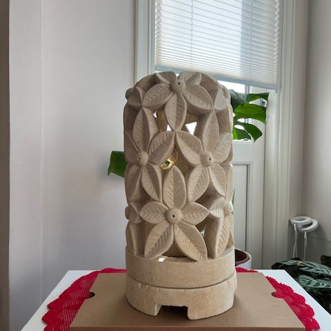 Dette er en 3d printet led-lampe i hvit, men kan lages i andre farger også. Den er 28 cm høy.