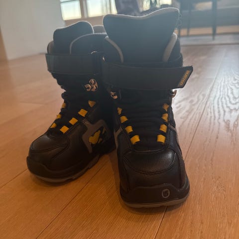 Burton Grom snowboardstøvler for barn i størrelse 38 (EU), tilsvarende 6 (US) og 24 cm. Støvlene er svarte med røde og rutete detaljer. Modellen har borrelåslukking foran for enkel justering og av/på. Myk og polstret innside gir god komfort og støtte til barneføtter.