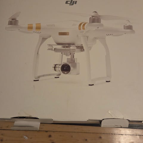DJI Phantom 3 drone i hvit farge. Quadkopter med fastmontert kamera på gimbal. I esken følger det med flere batterier, fjernkontroll, ladere, propeller og brukerveiledning, slik det fremgår av bildene. Egnet for luftfoto og videoopptak samt rekreasjonsflyging.